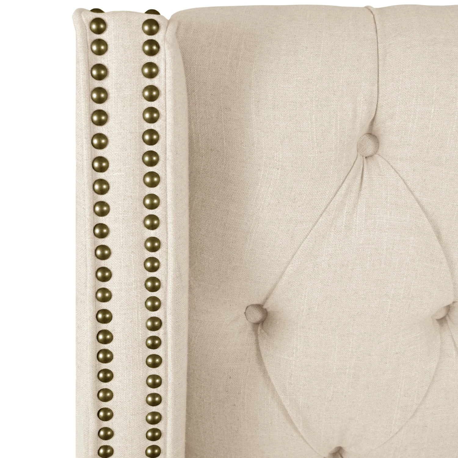 Traditional style is given a modern treatment in this bed with its tufted headboard, subtly winged with orderly rows of upholstery tacks. With a design set for a luxe night’s rest or morning cup of tea, this bed frame can suit a vintage-inspired aesthetic or bring a touch of chic visual texture to a tailored space.