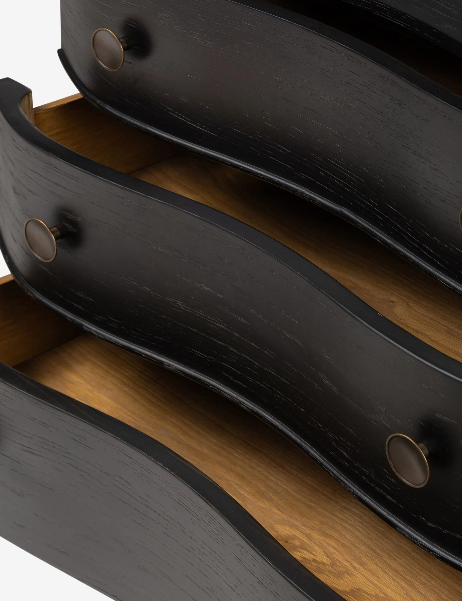 The Amherst nightstand takes notes from antique European styles and brings them to life in a beautiful oak design. In a beautifully distressed black finish, this large nightstand features three drawers for plenty of bedside storage. Round metal pulls complete the look with a touch of luster.