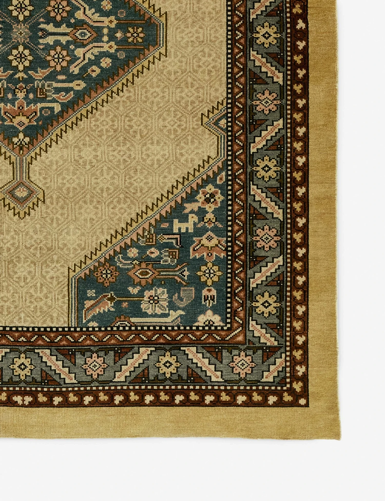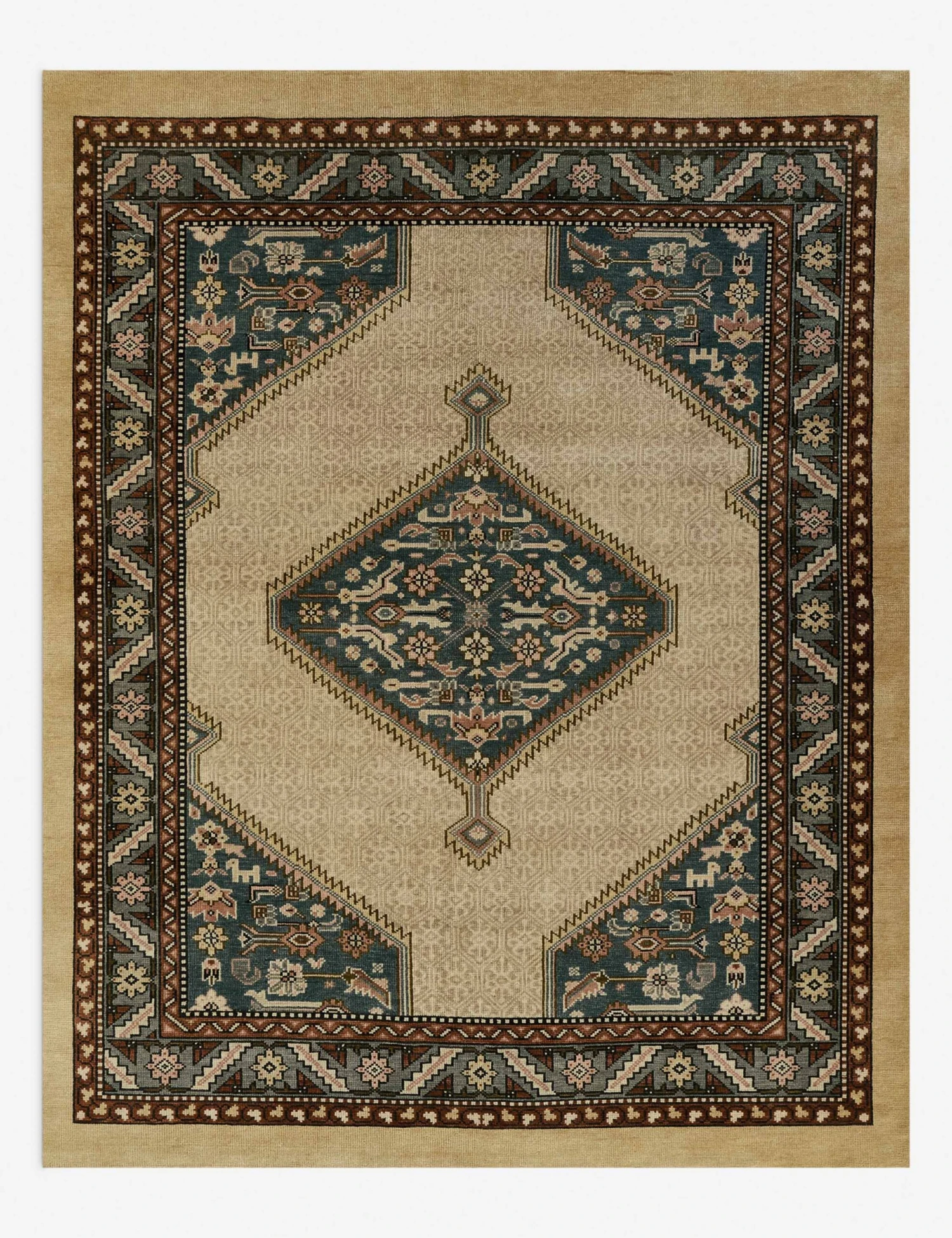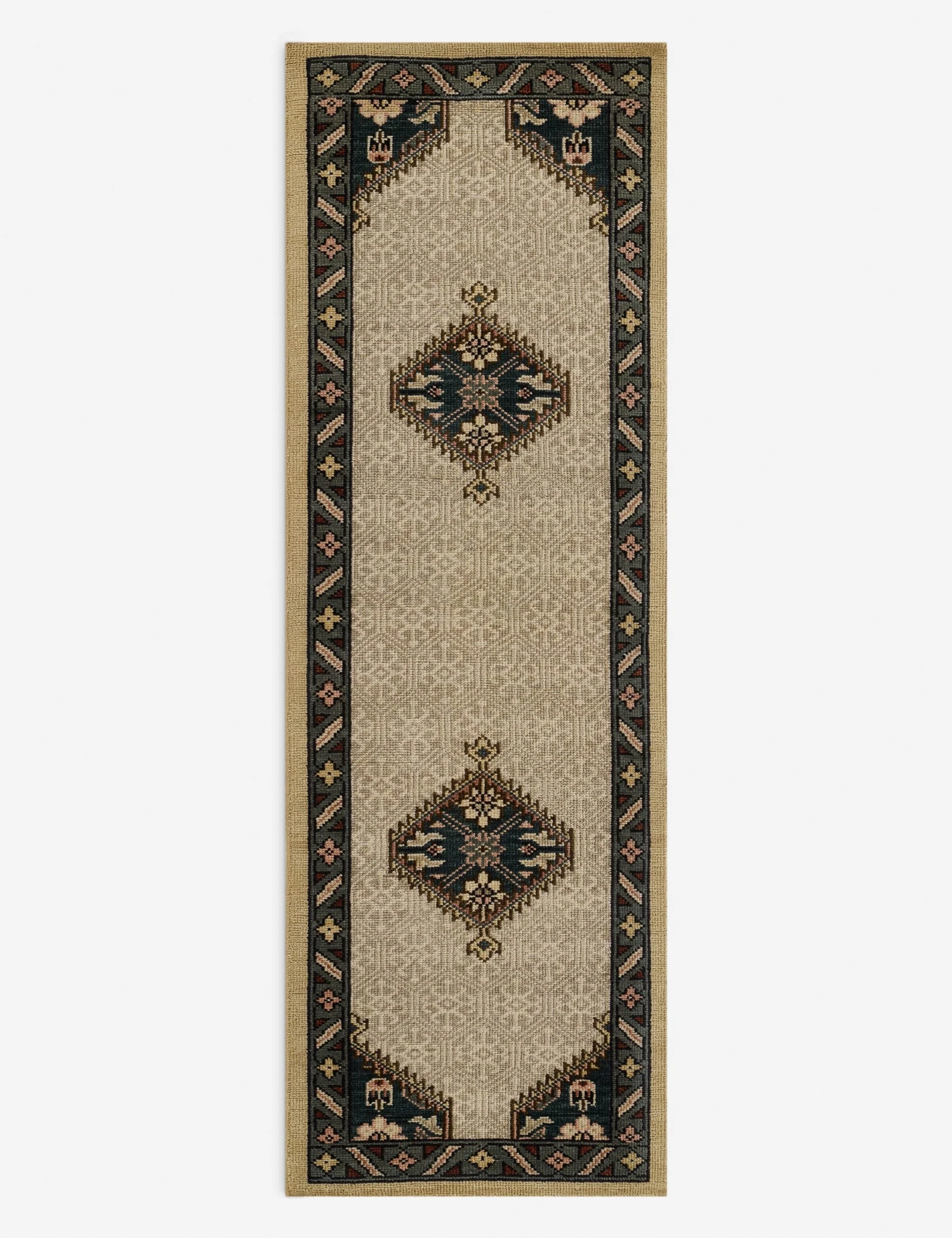 Bold hues bring a fresh look to this traditional floor rug. The design features a central medallion with border detailing that pops on a neutral field. With its handwoven construction and natural fiber blend, this rug offers a soft yet durable foundation that can elevate any space from an entry hall to your dining room or lounge.