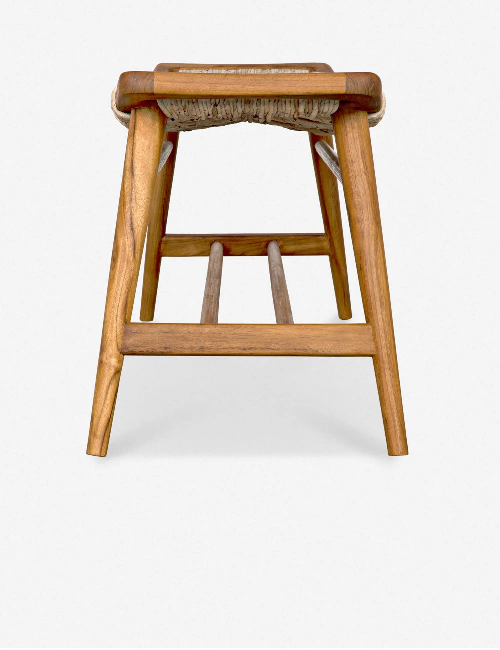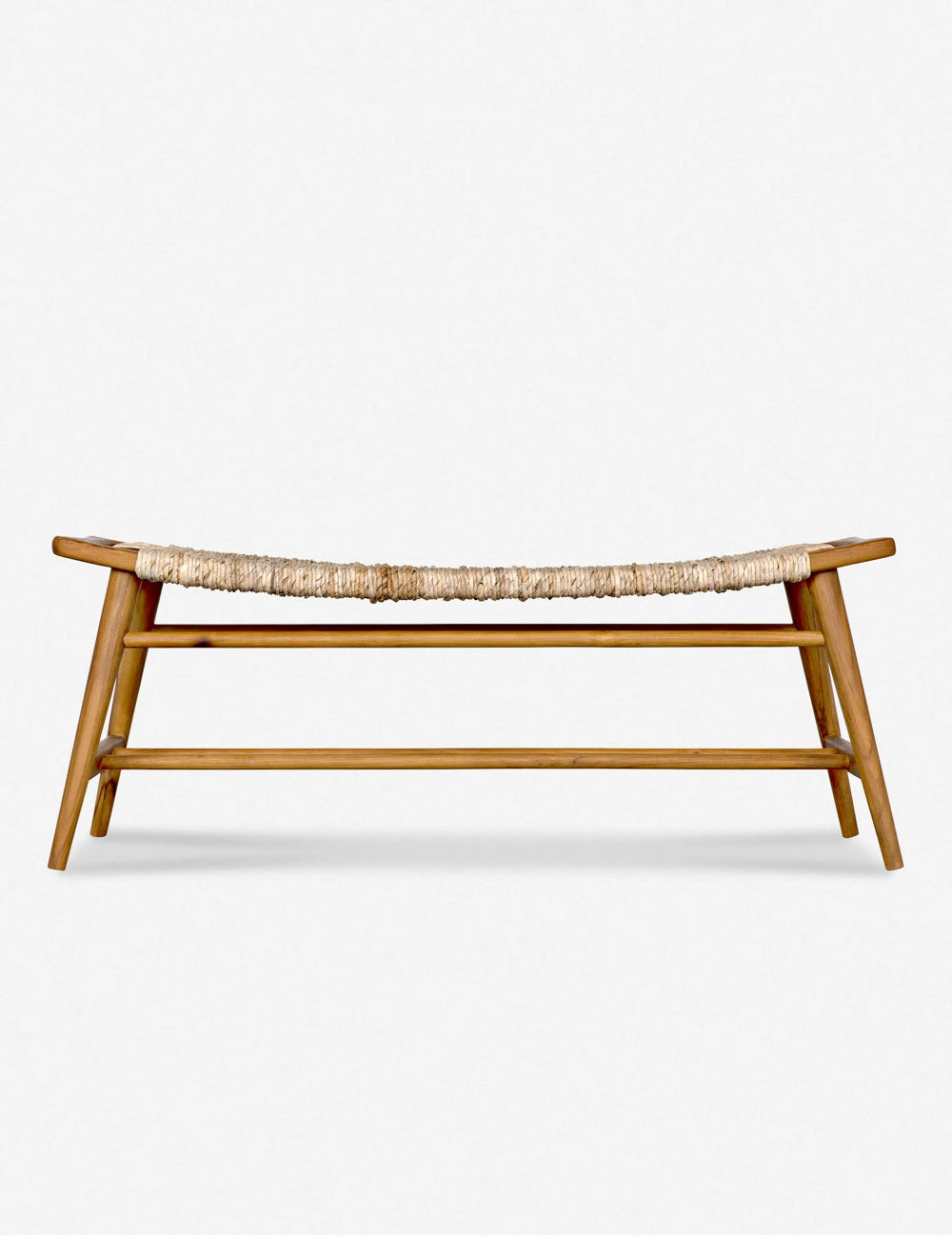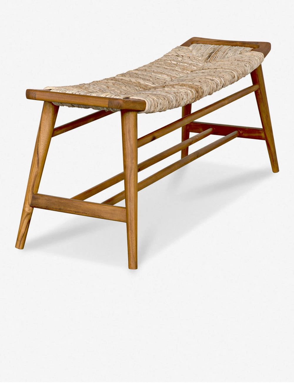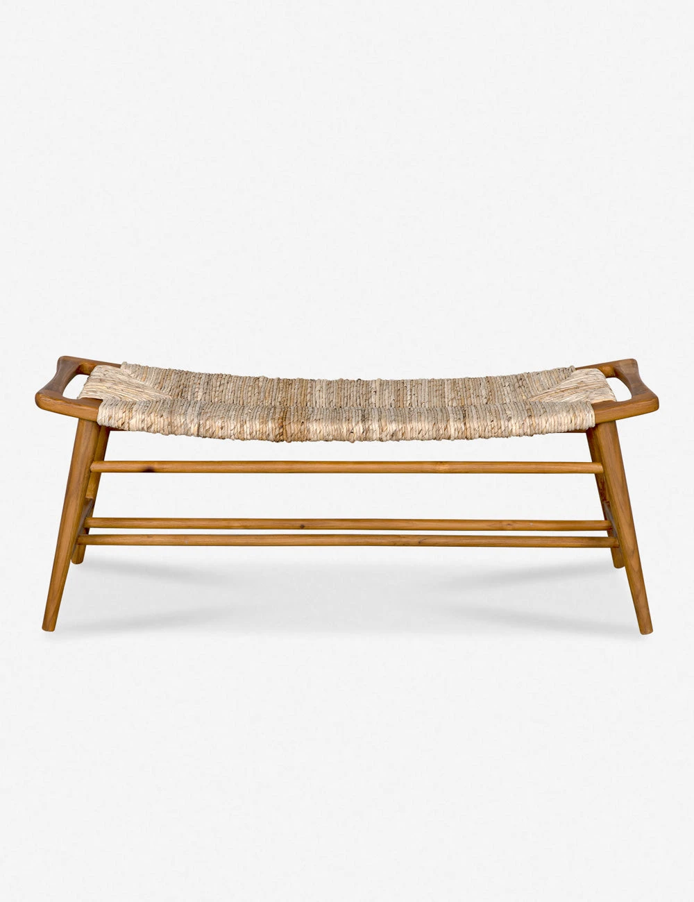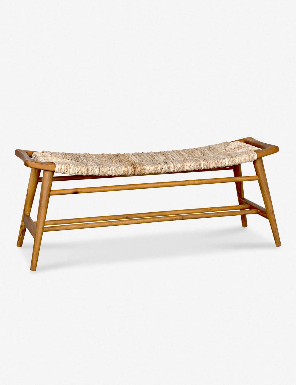 A woven rush seat offers endless textural appeal to the sleek teak frame of this versatile bench. The curved bench seat provides a stylish edge that will look great in an organically inspired entryway or coastal breakfast nook.