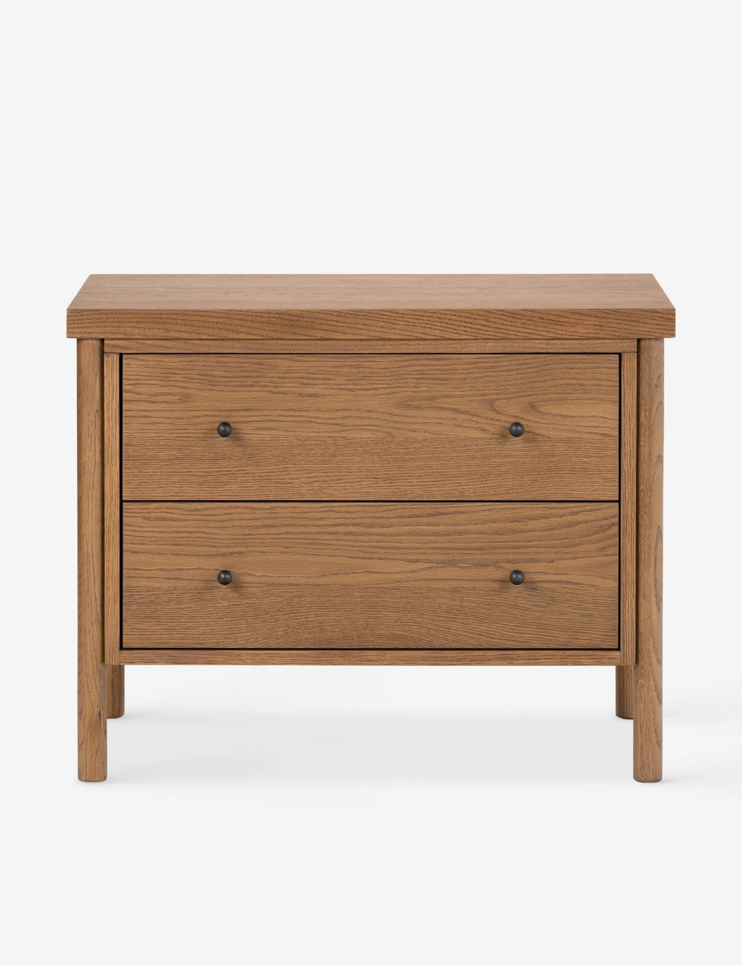 The Kisner nightstand brings transitional appeal to oak. Rounded legs hold a clean-lined frame in a warm finish that showcases the natural grain. Two spacious drawers bring ample storage to this modern nightstand.