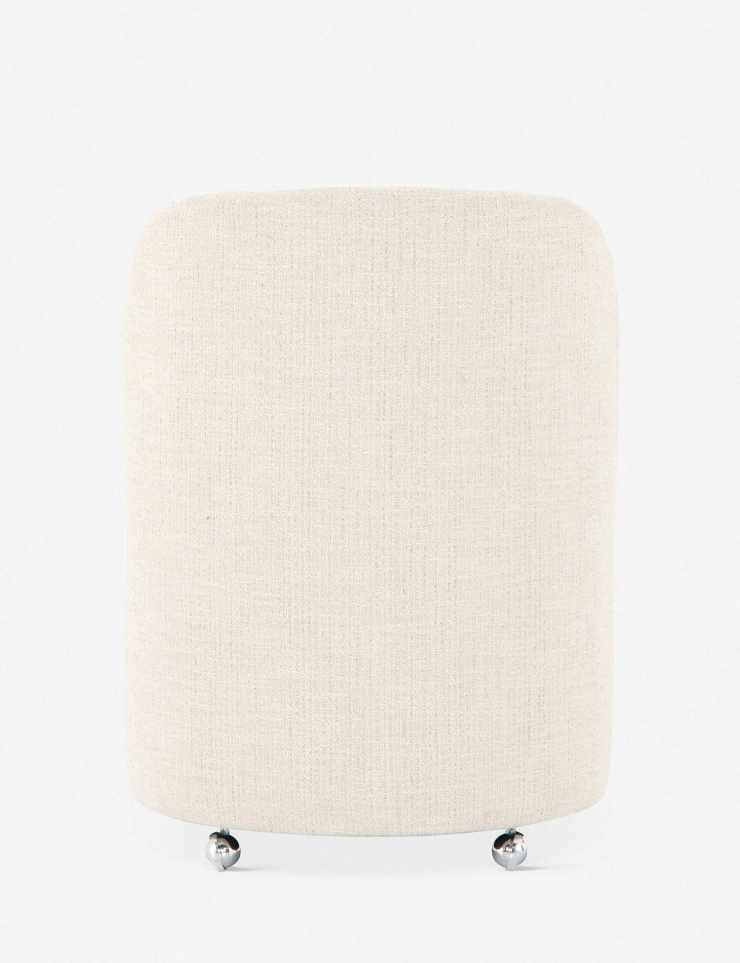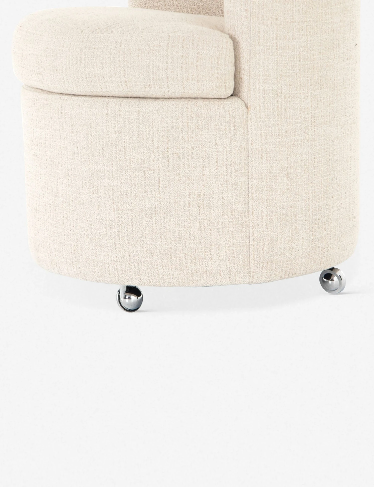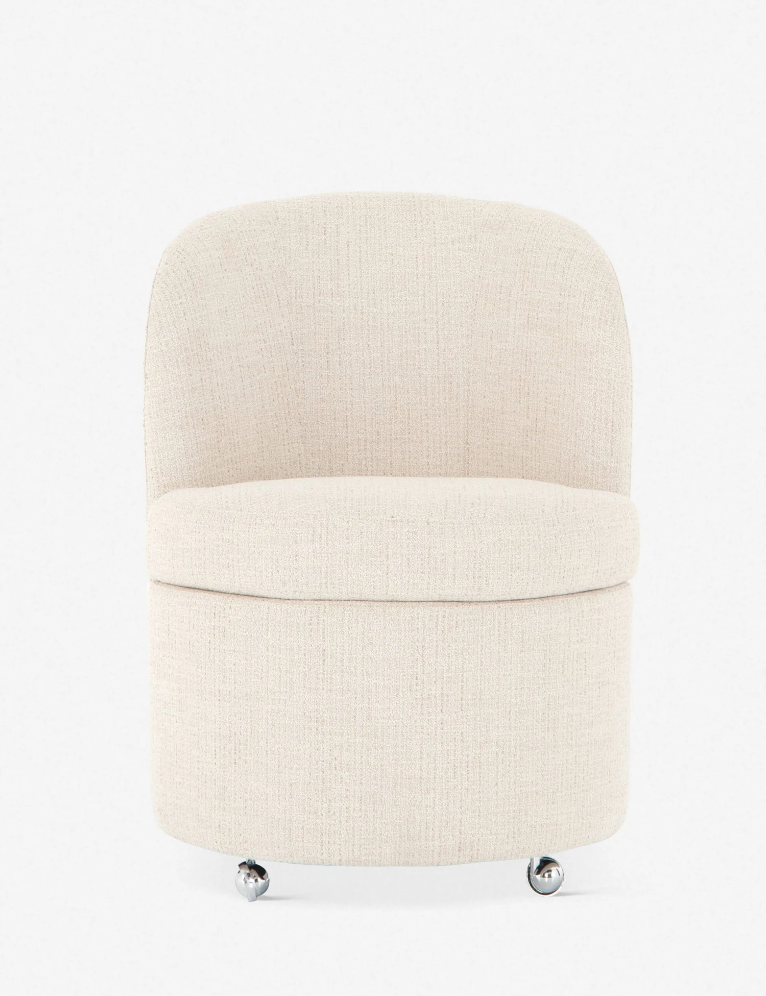 Beautifully balance a standout, shapely design and effortless mobility at your dinner table with this dining room chair. A drum-style seat and curved back are fully tailored in a textural, cream-colored upholstery, so this dining chair seemingly floats above chrome casters. We love sitting this dining chair with lighter wood finishes and refined neutrals.
